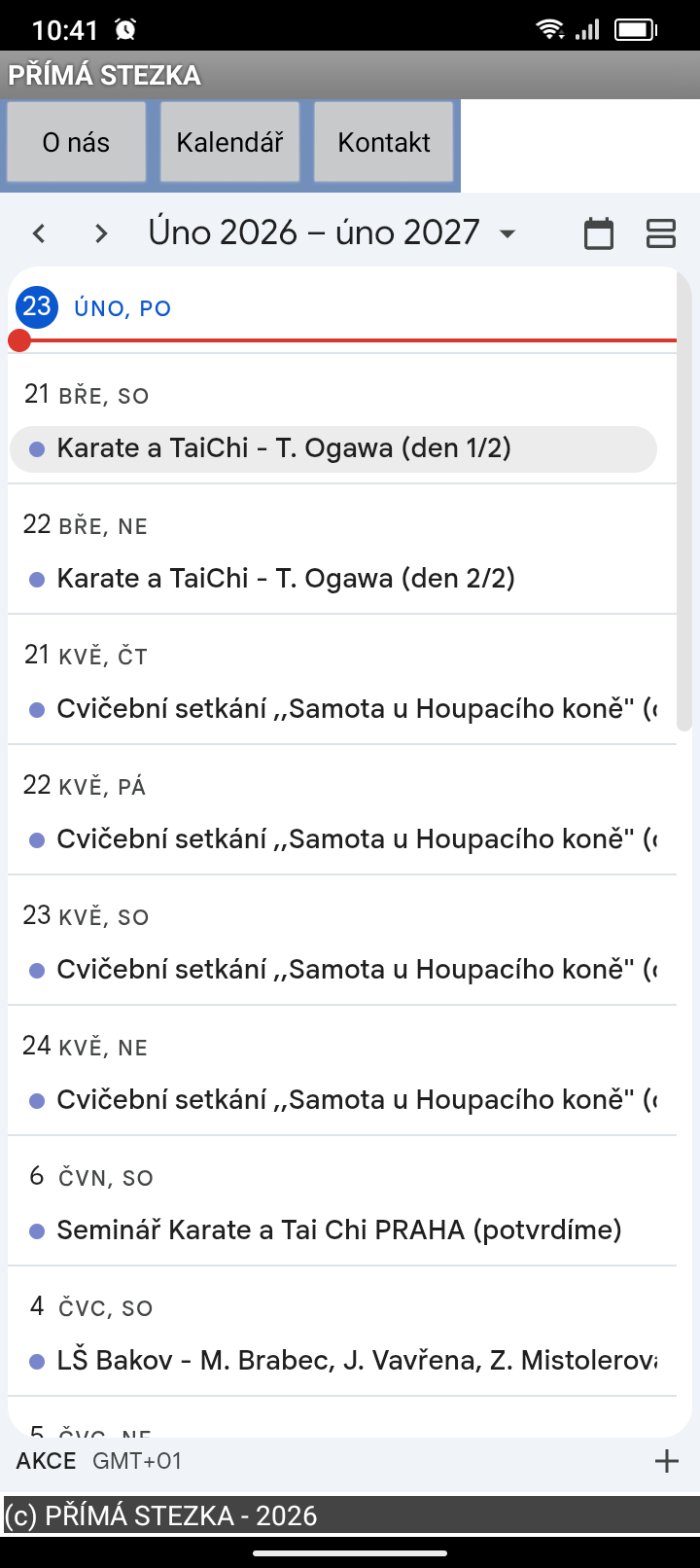 Aplikace slouží jako centrální informační rozhraní – poskytuje základní přehled o projektu Přímá Stezka, aktuální seznam akcí a dostupné kontaktní informace.